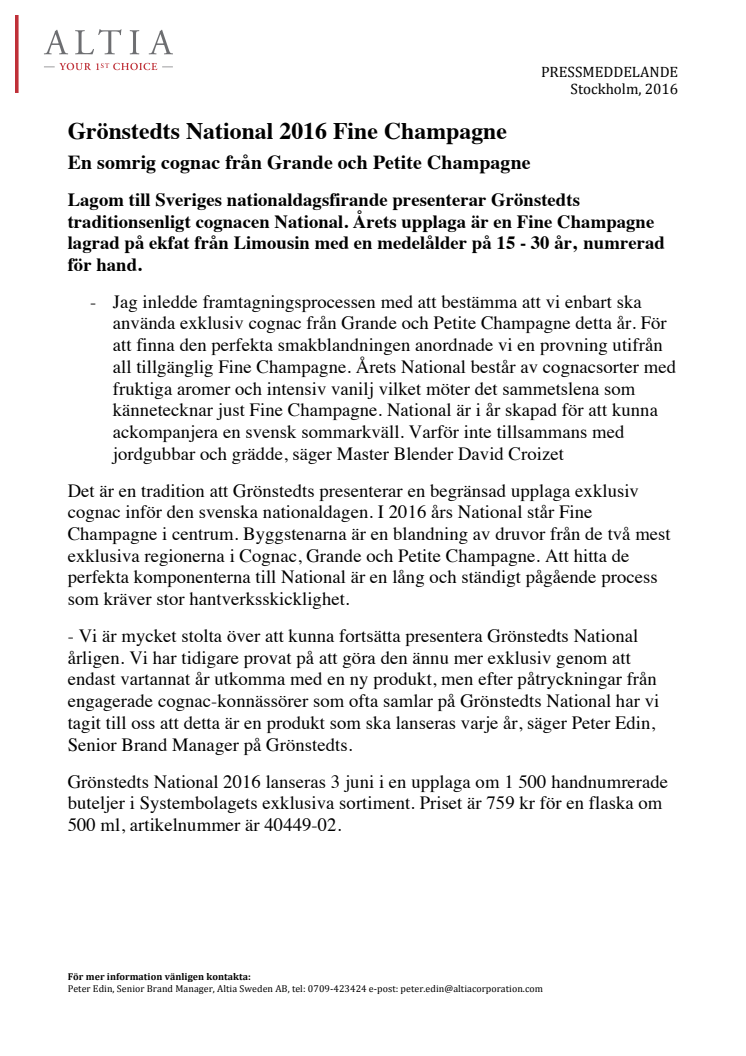 Lagom till Sveriges nationaldagsfirande presenterar Grönstedts traditionsenligt cognacen National. Årets upplaga är en Fine Champagne lagrad på ekfat från Limousin med en medelålder på 15 - 30 år, numrerad för hand.