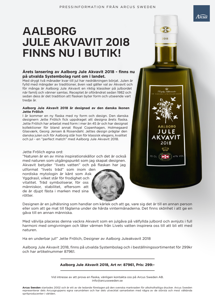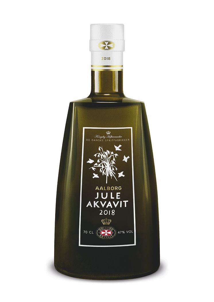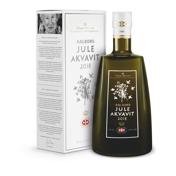 I år kommer en ny flaska med ny form och design. Den danska designern Jette Frölich fick uppdraget att designa årets flaska. Jette Frölich har arbetat med form i mer än 45 år och har designat kollektioner för bland annat Royal Copenhagen, Holmegaard Glasværk, Georg Jensen & Rosendahl. Jettes design präglar den danska julen och för Aalborg står hon för klassisk elegans, kvalitet och jul - en ”perfect match” med Aalborg Jule Akvavit 2018.