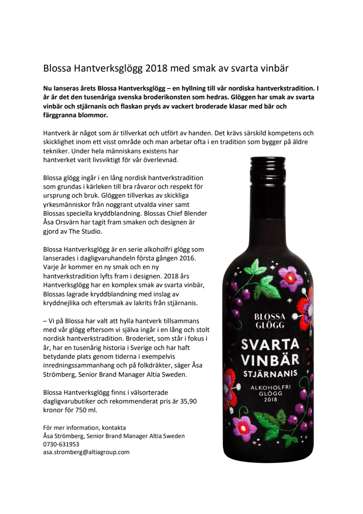 – Vi på Blossa har valt att hylla hantverk tillsammans med vår glögg eftersom vi själva ingår i en lång och stolt nordisk hantverkstradition. Broderiet, som står i fokus i år, har en tusenårig historia i Sverige och har haft betydande plats genom tiderna i exempelvis inredningssammanhang och på folkdräkter, säger Åsa Strömberg, Senior Brand Manager Altia Sweden.