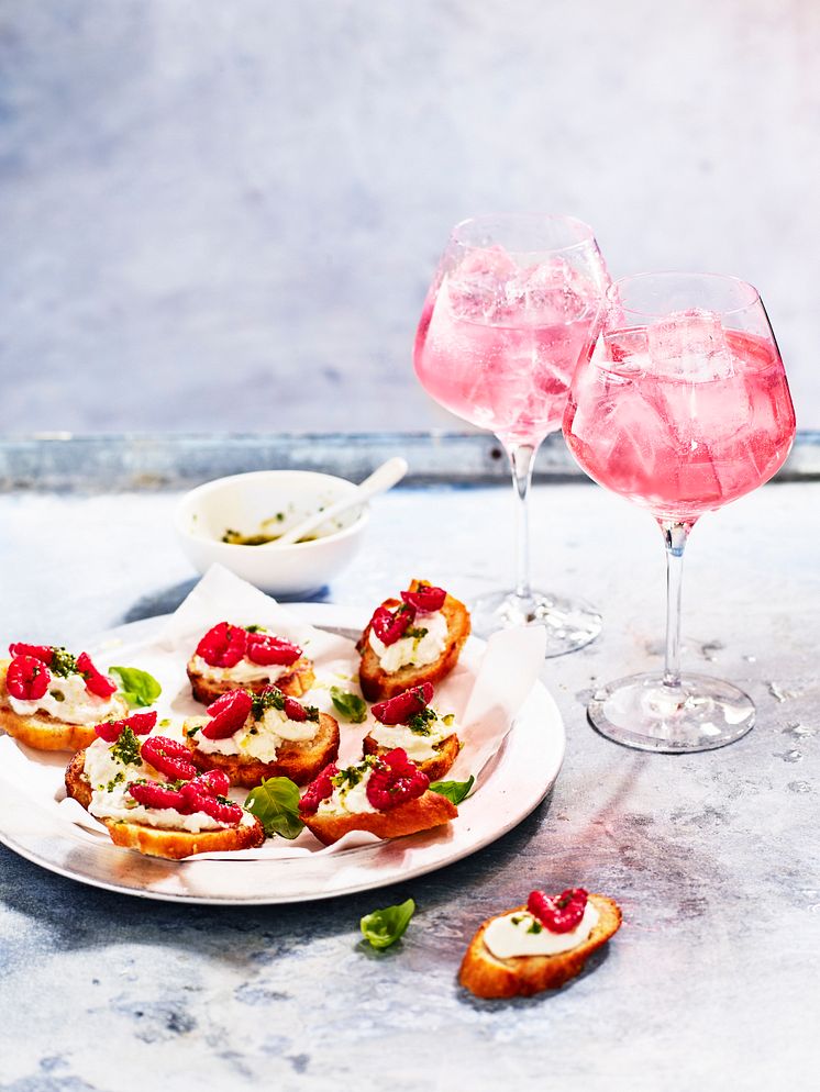 Crostini med krämig burrata, hallon och örtolja till Petronella Hallon