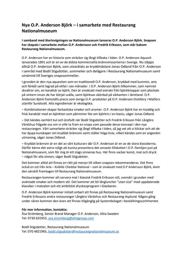 I samband med återinvigningen av Nationalmuseum lanseras O.P. Anderson Björk. Snapsen har skapats i samarbete mellan O.P. Andersson och Fredrik Eriksson, som står bakom Restaurang Nationalmuseum.