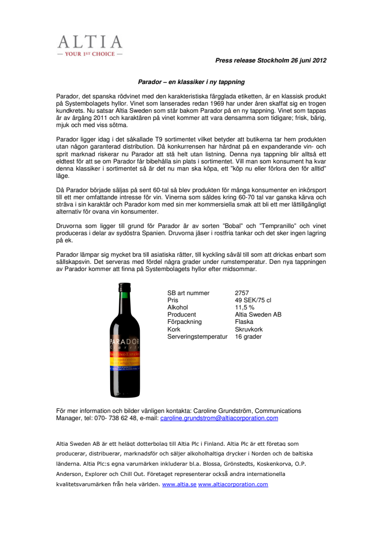 Parador, det spanska rödvinet med den karakteristiska färgglada etiketten, är en klassisk produkt på Systembolagets hyllor. Vinet som lanserades redan 1969 har under åren skaffat sig en trogen kundkrets. Nu satsar Altia Sweden som står bakom Parador på en ny tappning. Vinet som tappas är av årgång 2011 och karaktären på vinet kommer att vara densamma som tidigare; frisk, bärig, mjuk och med viss sötma.