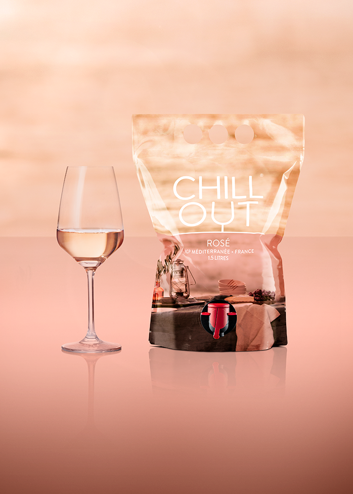 • CHILL OUT Rosé IGP Méditerranée 1,5 L, rosa bakgrund